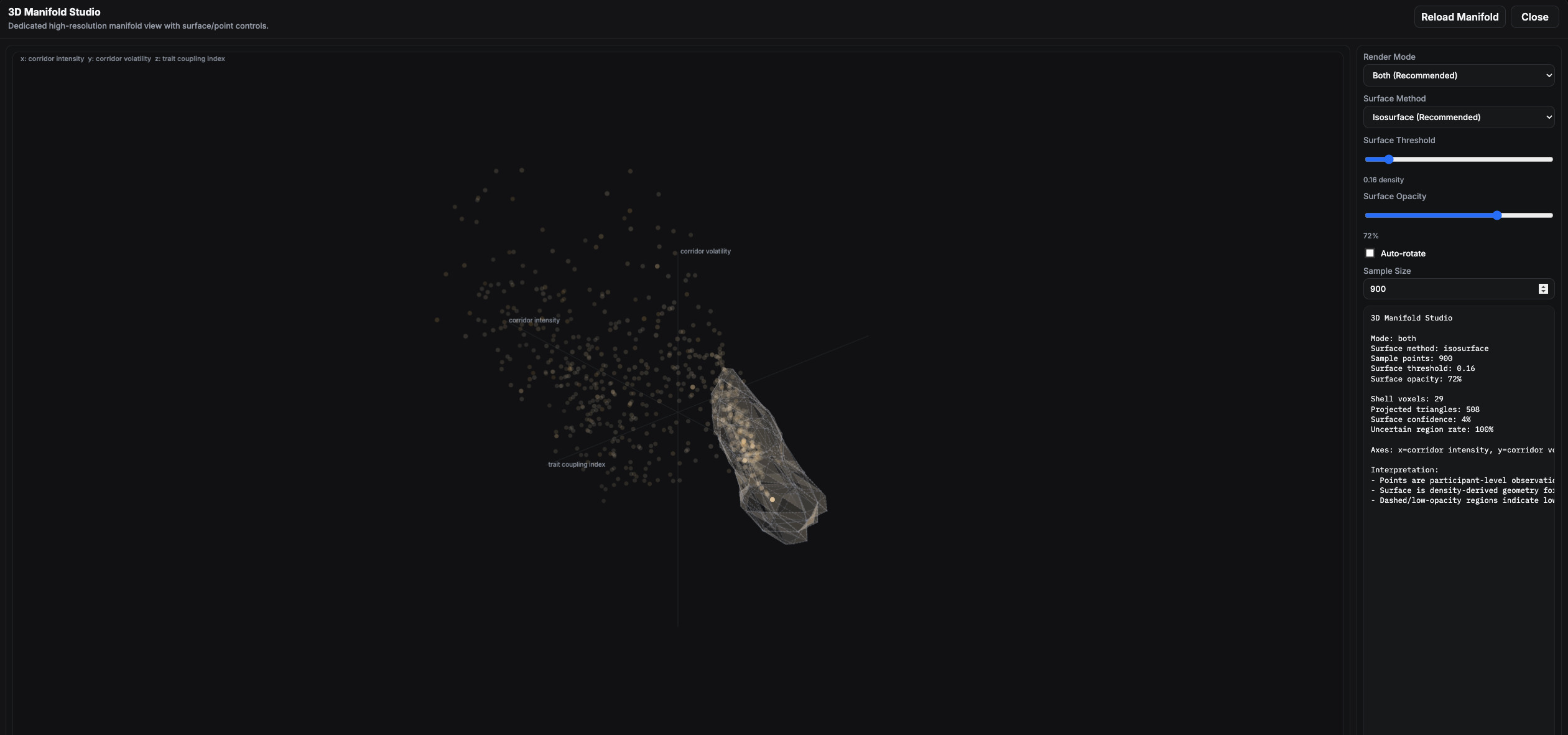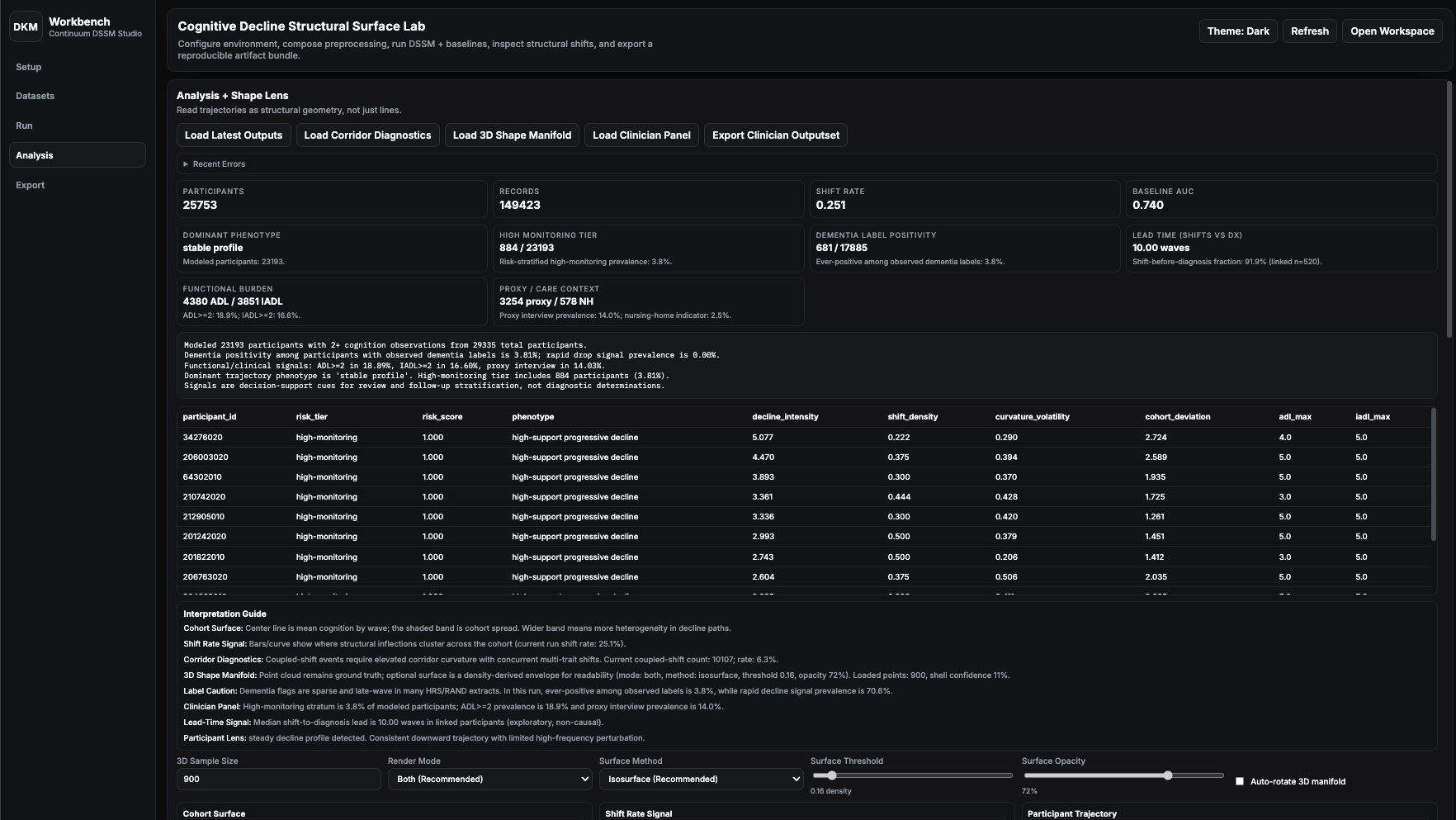 Representative captures from the Health DKM toolchain, including participant-level views, state-surface outputs, and geometric analysis panels.